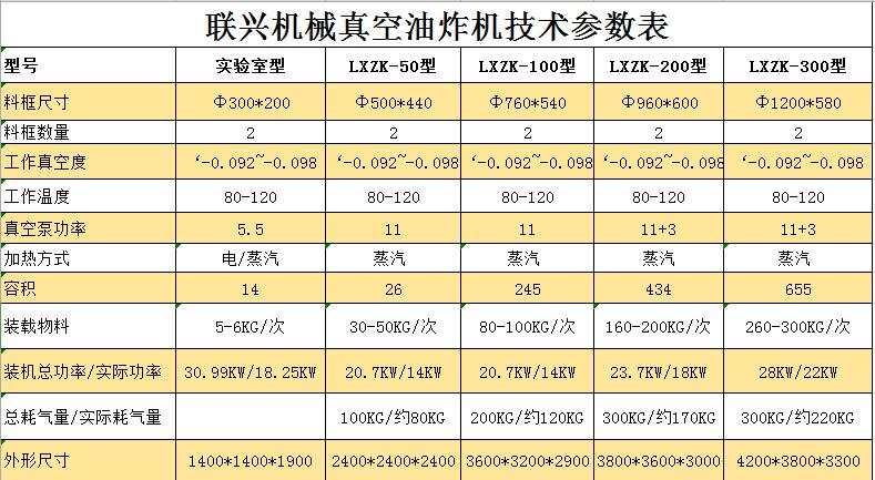 聯(lián)興機(jī)械香菇脆真空油炸機(jī)技術(shù)參數(shù)表